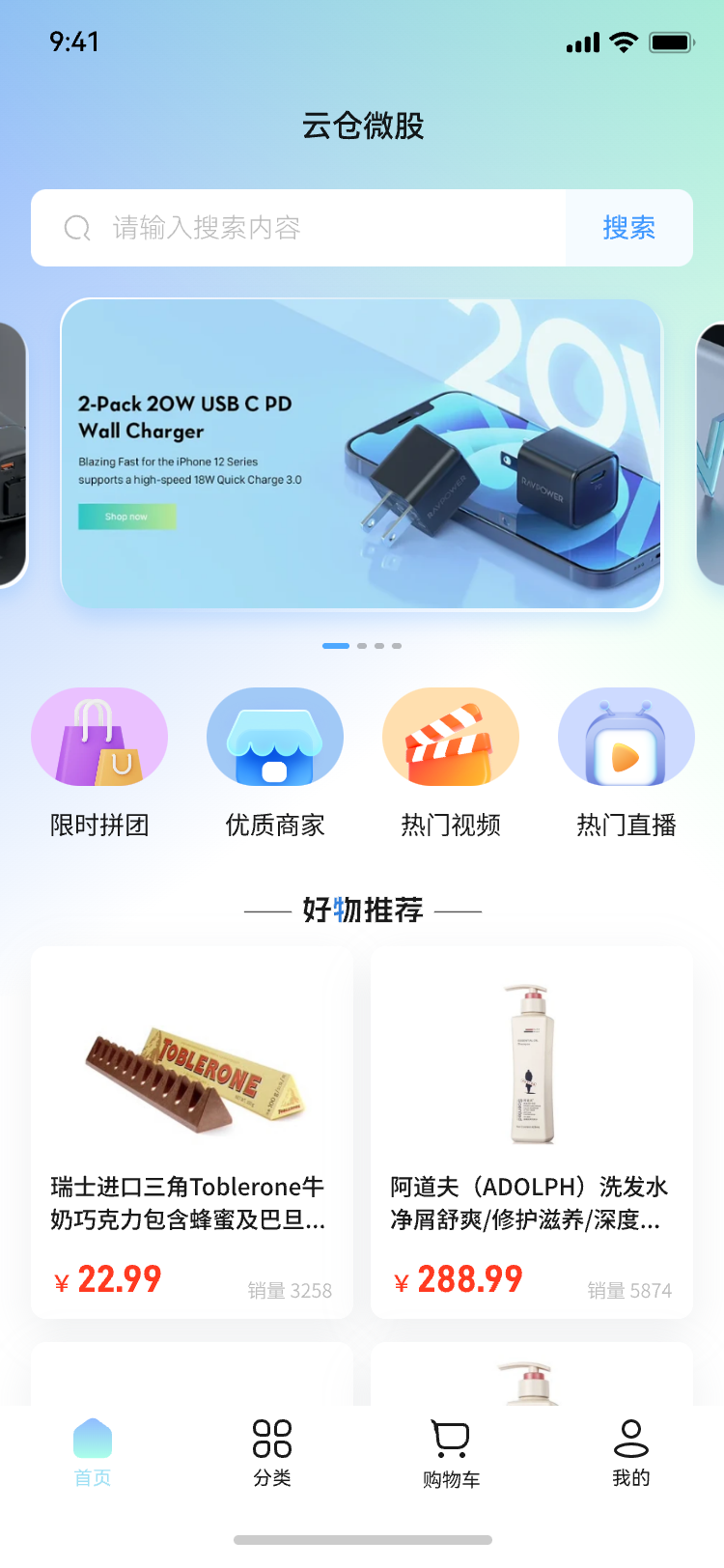 云仓微股主要功能分为:购买下单,短视频,直播,金币兑换,拼团等。